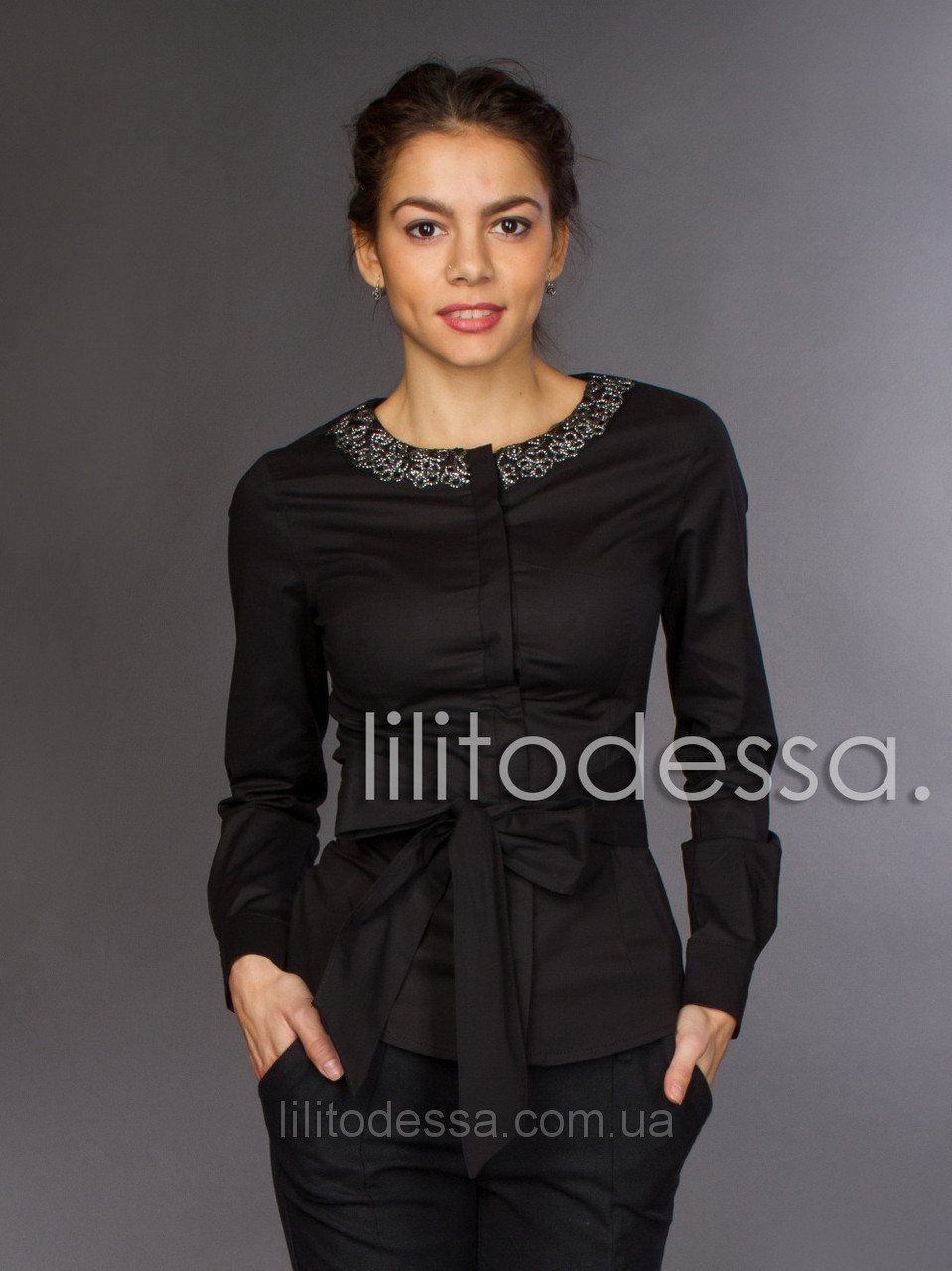 Приталенная Блуза со скрытой линией пуговиц, круглый ворот украшен люрексом и пайетками. Отлично смотрится как с поясом так и без. Пояс в комплекте. Ткань - коттон, состав - хлопок/полиестер. Длина - ок. 57см.,Длина рукава - ок. 60см.