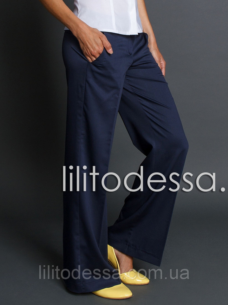 Брюки широкие с низкой посадкой с легка расклешены от колена, итальянские карманы по бокам и имитация врезных карманов сзади. Застёжка на молнию, внутреннюю пуговицу и крючок. Лёгкая ткань - "костюмная вискоза" (стрейч),Сезон - Лето. Длина - ок.95-99см., Внутренний шов - ок75-79см., Ширина штанины - ок.30см.