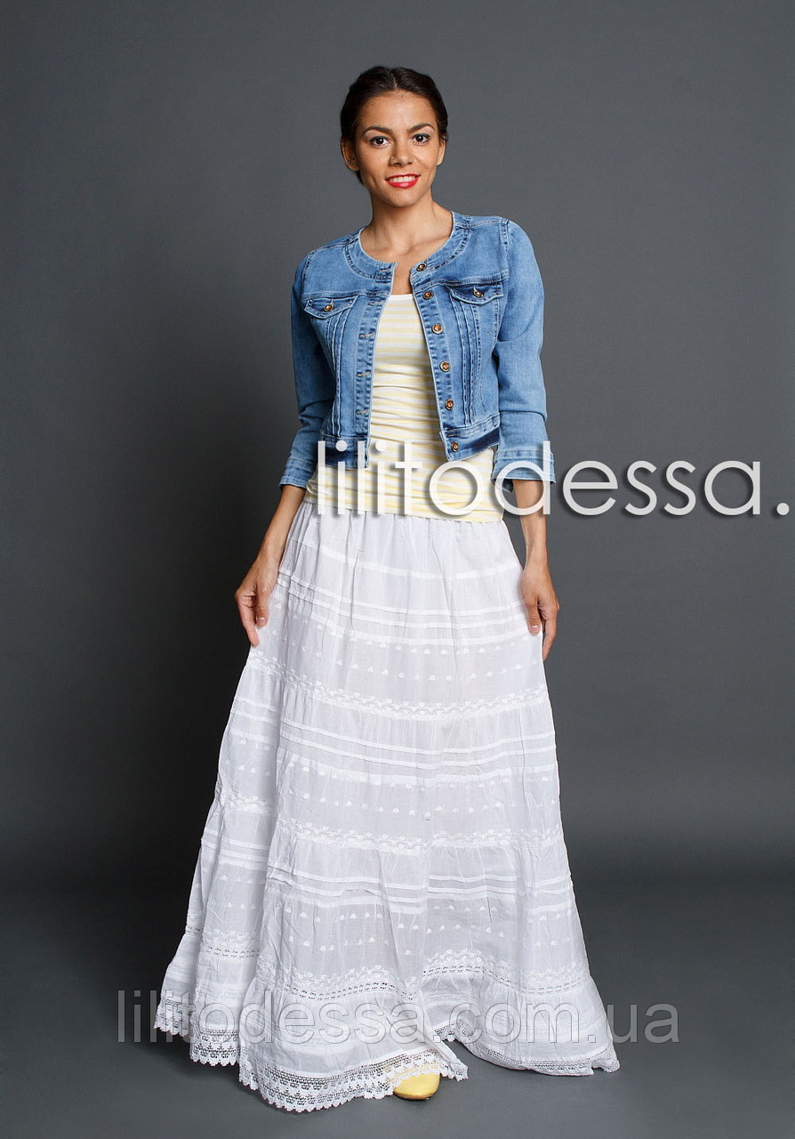 Юбка на резинке, украшена вытканным рисунком и кружевом, на тонкой подкладке. Материал - хлопок 100%. Длина - ок.97см.;