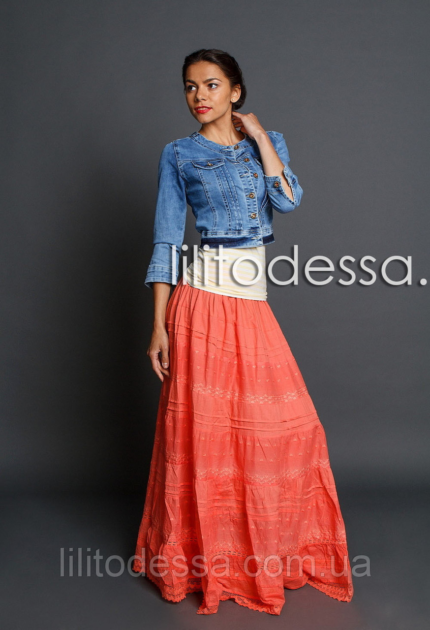 Юбка на резинке, украшена вытканным рисунком и кружевом, на тонкой подкладке. Материал - хлопок 100%. Длина - ок.97см.;