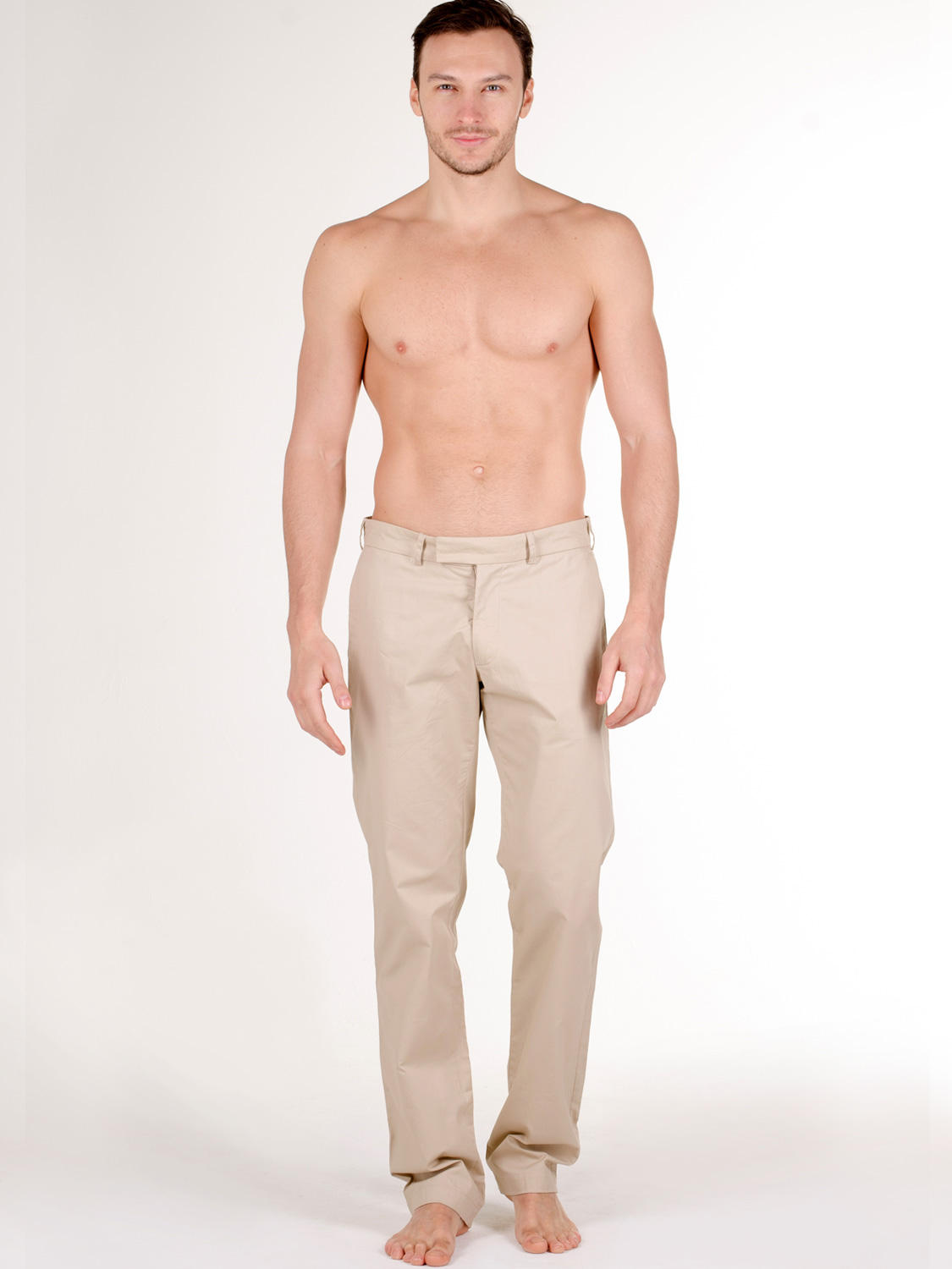 Мужские брюки из хлопка прямого кроя. По бокам 2 прорезных косых кармана. Маленький кармашек для монет.