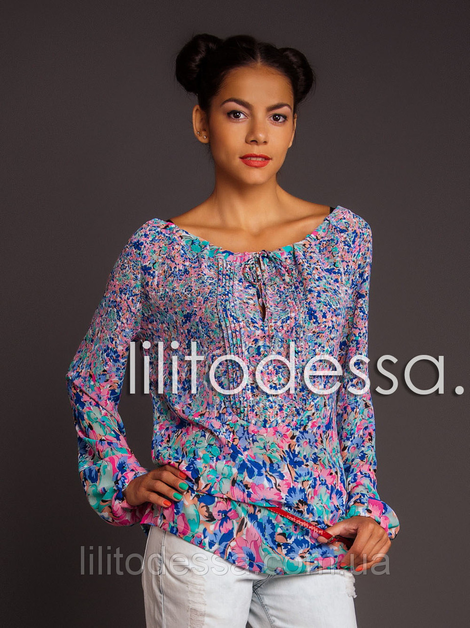 Блуза с широким декольте на шнурке, на груди округлая вставка с защипами, рукав на резинке. Ткань - креп-шифон. Длина - ок. 65см.,Длина рукава - ок. 63см.