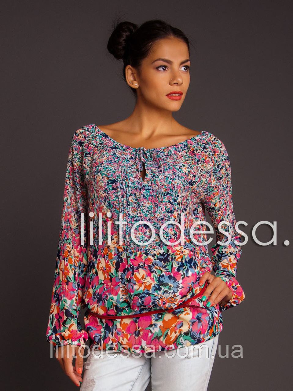 Блуза с широким декольте на шнурке, на груди округлая вставка с защипами, рукав на резинке. Ткань - креп-шифон. Длина - ок. 65см.,Длина рукава - ок. 63см.