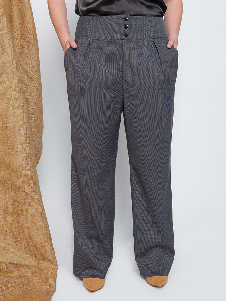 Классические брюки с удобными функциональными карманами, на широком поясе, задняя часть изделия декорирована клапанами. Фасон штанин ровный.