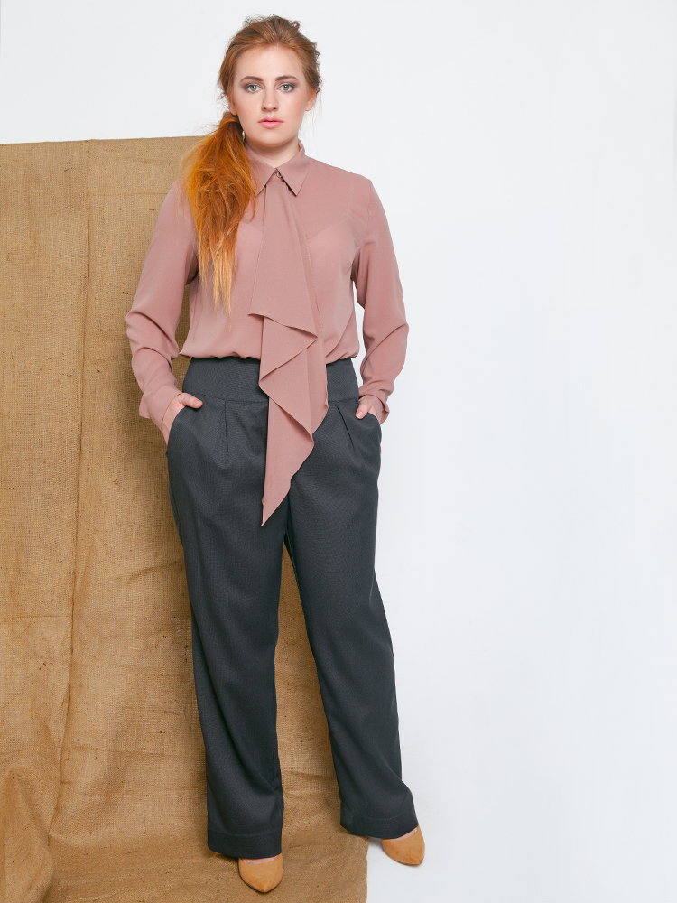 Классические брюки с удобными функциональными карманами, на широком поясе, задняя часть изделия декорирована клапанами. Фасон штанин ровный.