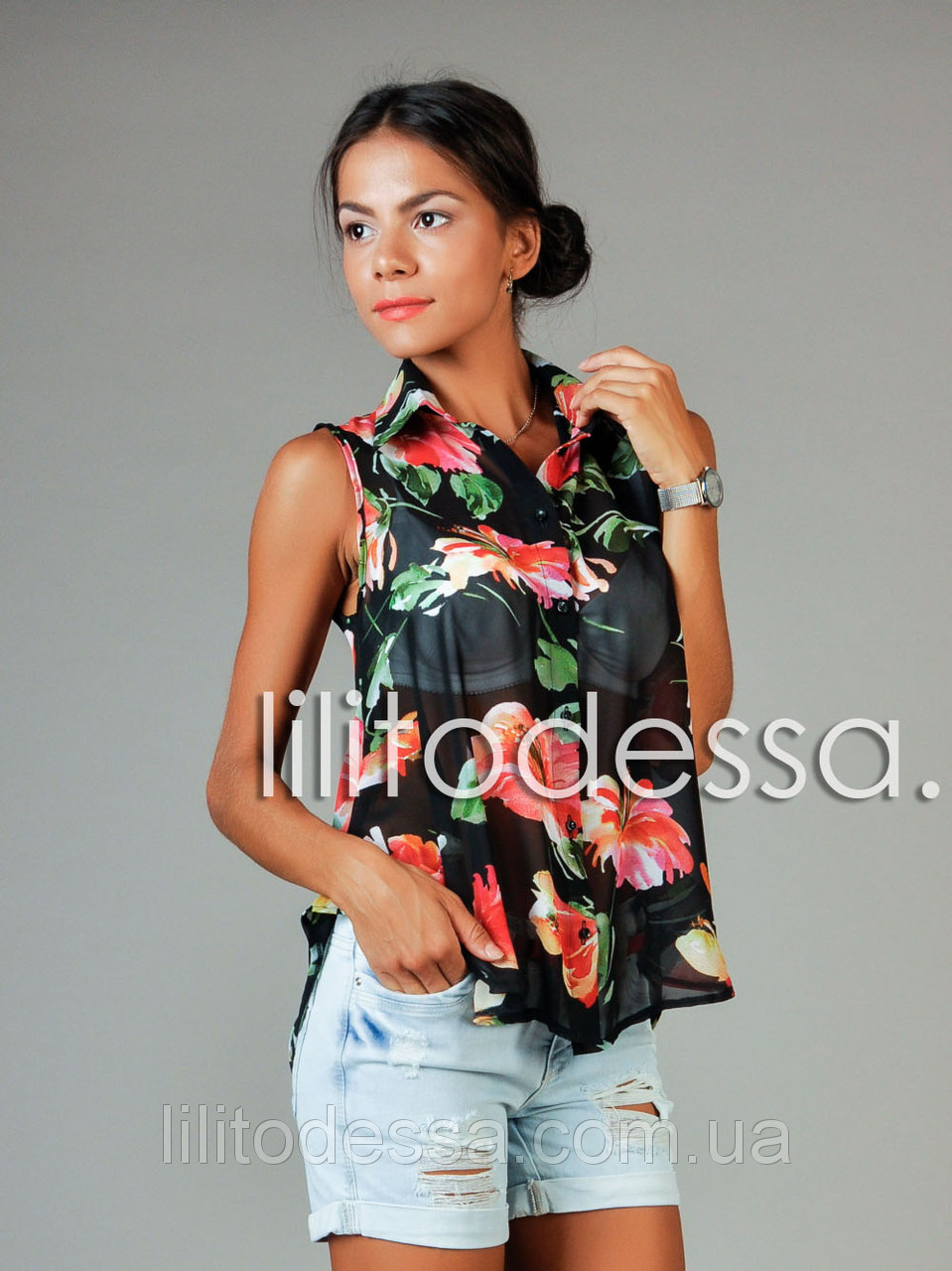 Лёгкая, полупрозрачная блуза с воротником. Расклешена к низу, с удлинённой спинкой. Ткань - шифон, состав - полиестер. Длина - ок. 56-58 см. / 66-68см.