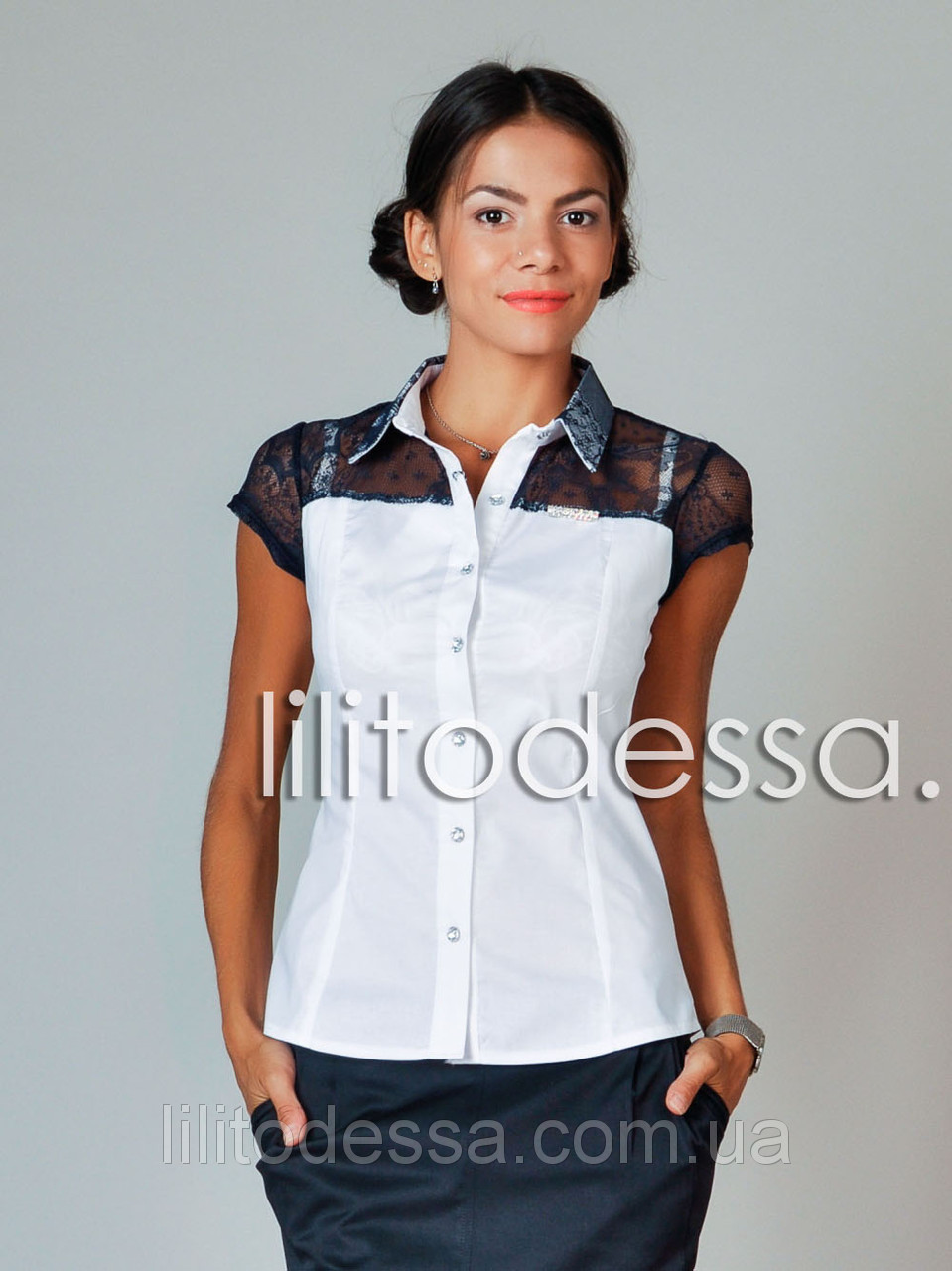 Блуза комбинирована гипюровыми вставками на плечах и воротнике, украшена брошью. Ткань - хлопок /полиэстер (стрейч). Длина - ок. 56см.;