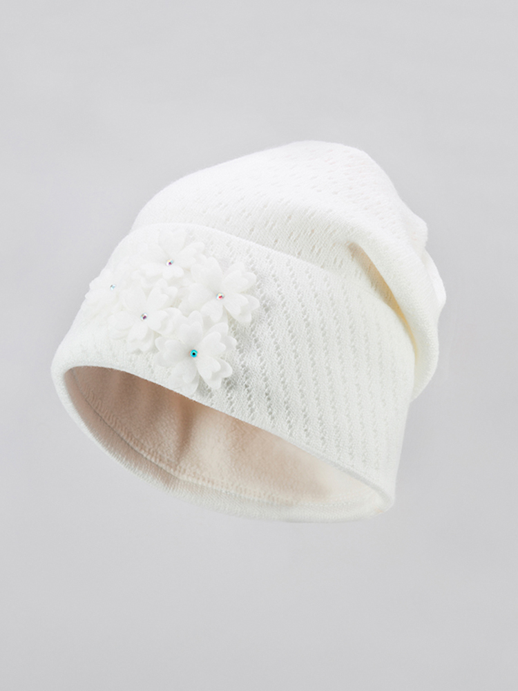 Шапка декоративной гладкой вязки с манжетом украшена цветами из кашемира и стразами, на подкладке из флиса.