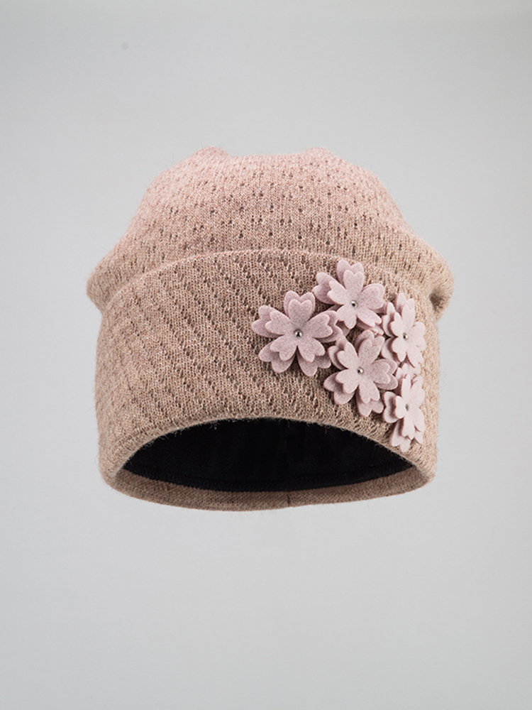 Шапка декоративной гладкой вязки с манжетом украшена цветами из кашемира и стразами, на подкладке из флиса.
