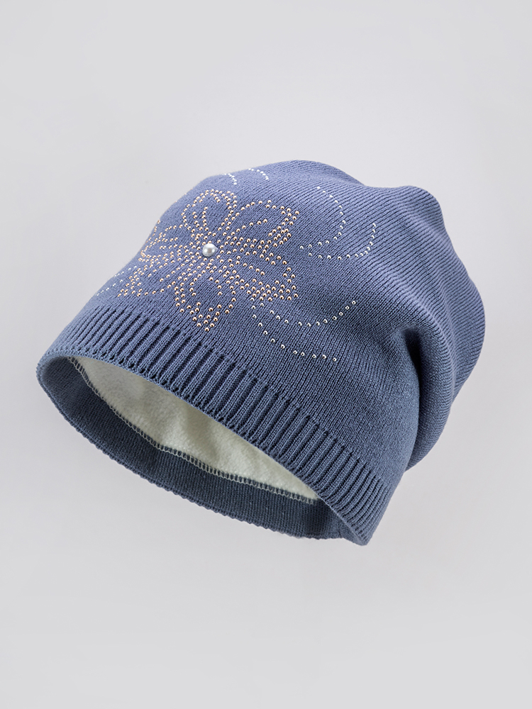 Шапка гладкой вязки с манжетом на подкладке из флиса с украшением жёлтого металла.
