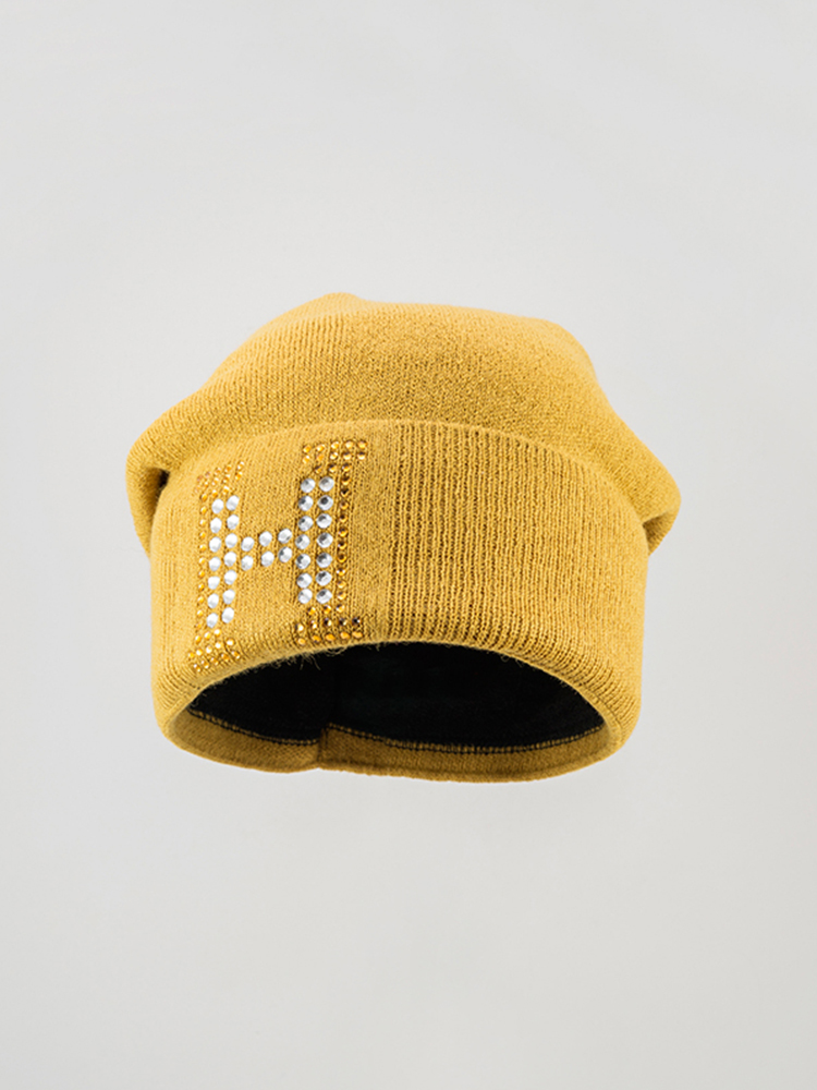 Шапка гладкой вязки с манжетом украшена стразами, подкладка из флиса.