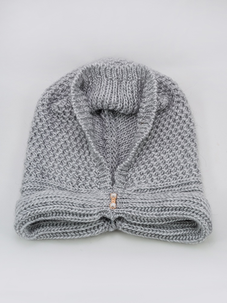 Капор объёмной вязки, тёплый, хорошо фиксируется на голове.