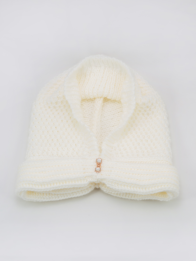 Капор объёмной вязки, тёплый, хорошо фиксируется на голове.