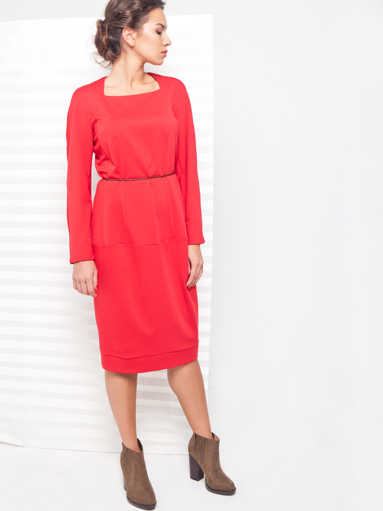 Однотонное платье слегка приталенного силуэта, юбка свободная, по низу расположен манжет благодаря которому придаёт женственный силуэт. В зависимости от комбинации с аксессуарами может быть как повседневным, так и праздничным.