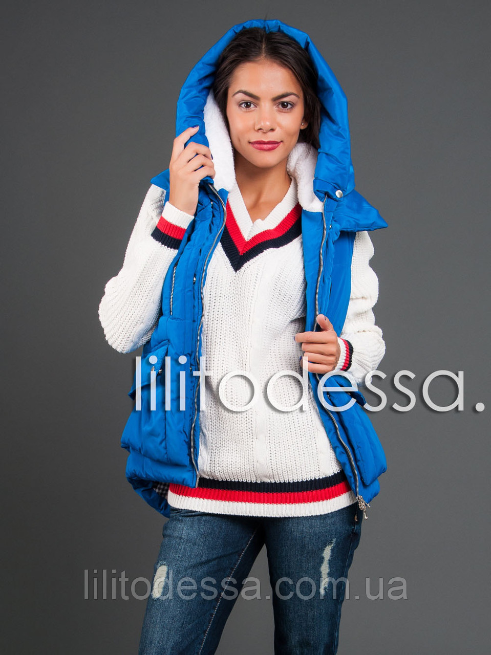 Жилетка с карманами, капюшон на плюшевой подкладке. Удлинённая спинка. На синтепоне. Сезон - Осень-Зима. Производство - Украина. Длина - ок.50/72см.;