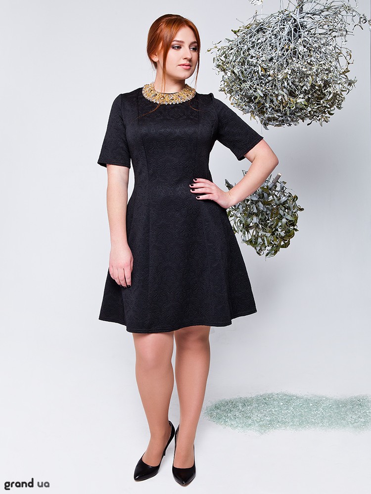 Платье из фактурного трикотажа, приталеного по линии талии и расклешенного по линии бедер, рельефы придают стройность фигуре, рукав до локтя. Легко дополняется аксессуарами.