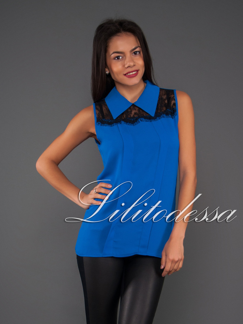 Блуза с отложным воротником и гипюровой вставкой на лицевой стороне, застёгивается на пуговичку сзади. Ткань - креп-шифон. Длина - ок. 67см., Производство - Украина.