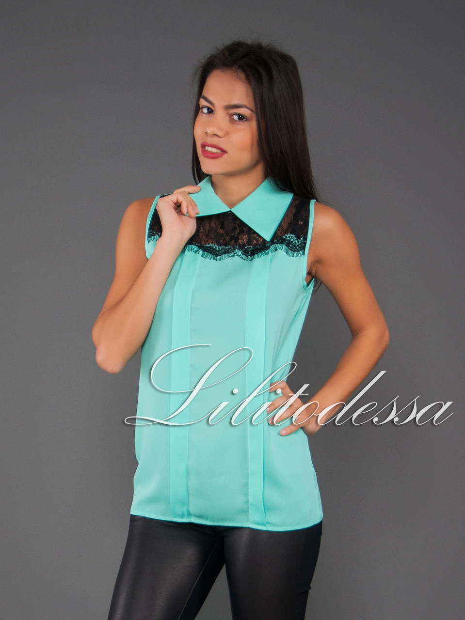 Блуза с отложным воротником и гипюровой вставкой на лицевой стороне, застёгивается на пуговичку сзади. Ткань - креп-шифон. Длина - ок. 67см., Производство - Украина.