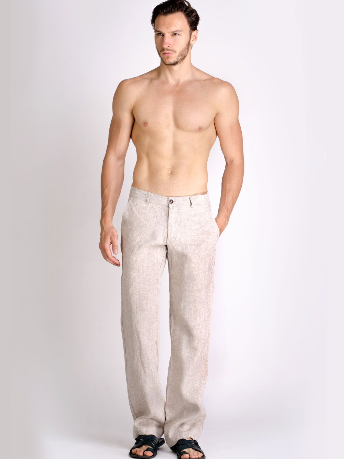 Мужские брюки изо льна свободного прямого кроя. Размерный ряд до р.62. Боковые прорезные карманы-хулиганы.