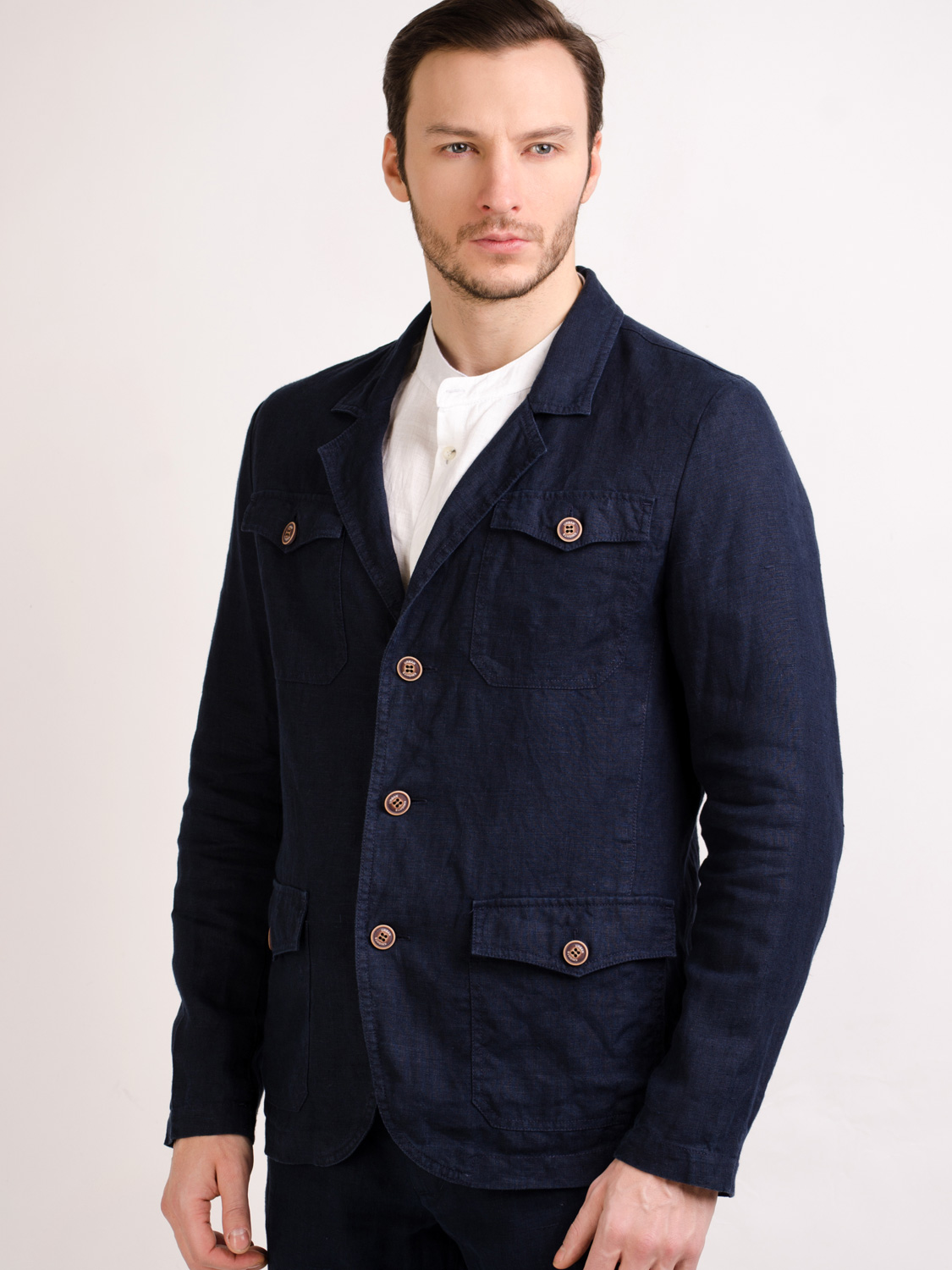 Простой и удобный, незаменимый аксессуар для лета. Пиджак выполнен без подкладки и имеет прямой силуэт. Отложной воротник с лацканом. Застегивается на 3 пуговицы. 4 накладных кармана с клапаном с пуговицей.