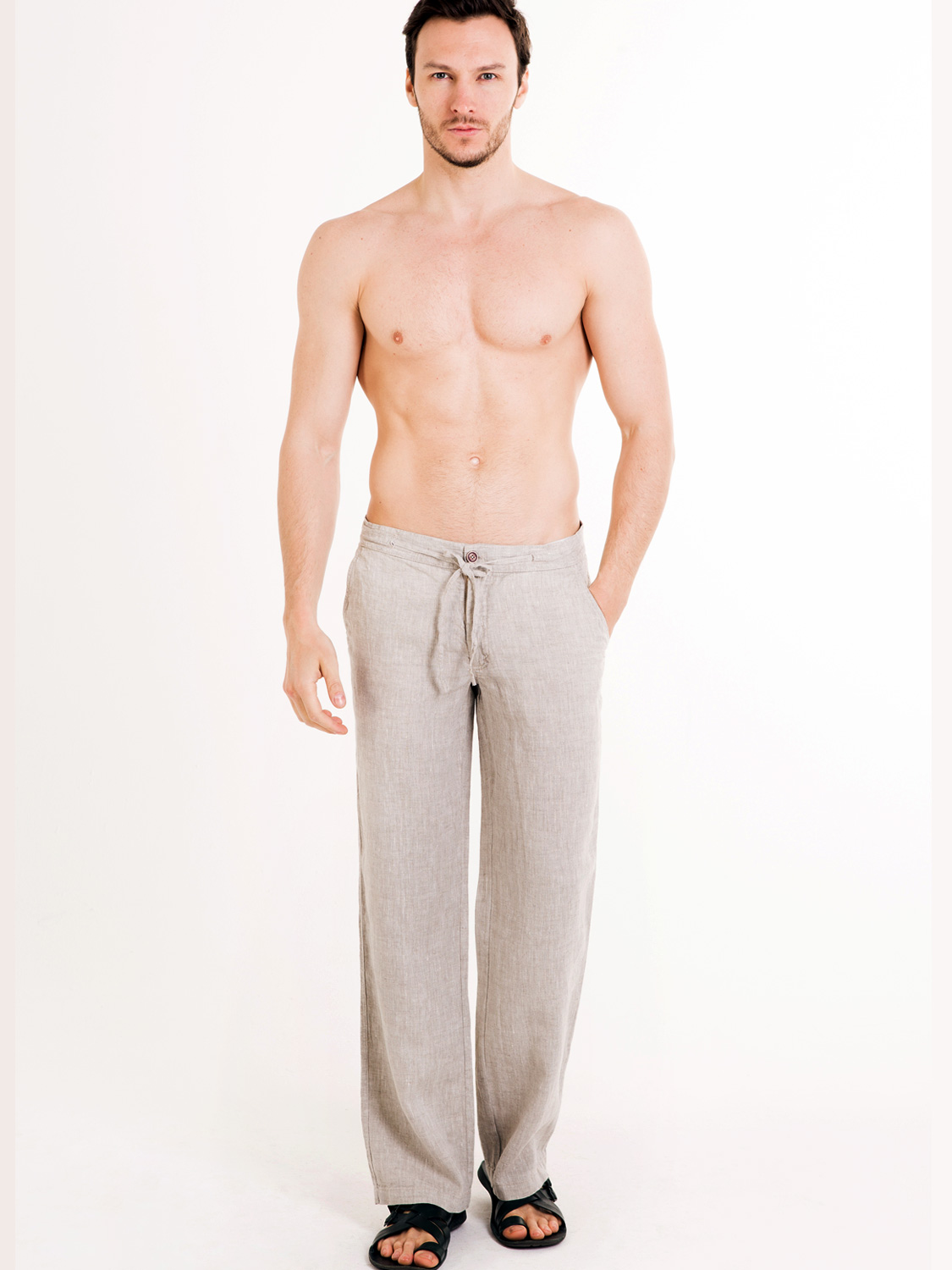 Мужские брюки из льна свободного прямого кроя из 100% белорусского льна высшего качества. Размерный ряд до р.62. Брюки в наличие в 3 цветах. Боковые прорезные карманы-хулиганы.Пояс на шнурке, гульфик на молнии. Сзади два накладных кармана, застегиваются на пуговицу. От колена прямые, ширина штанины внизу - 25 см.