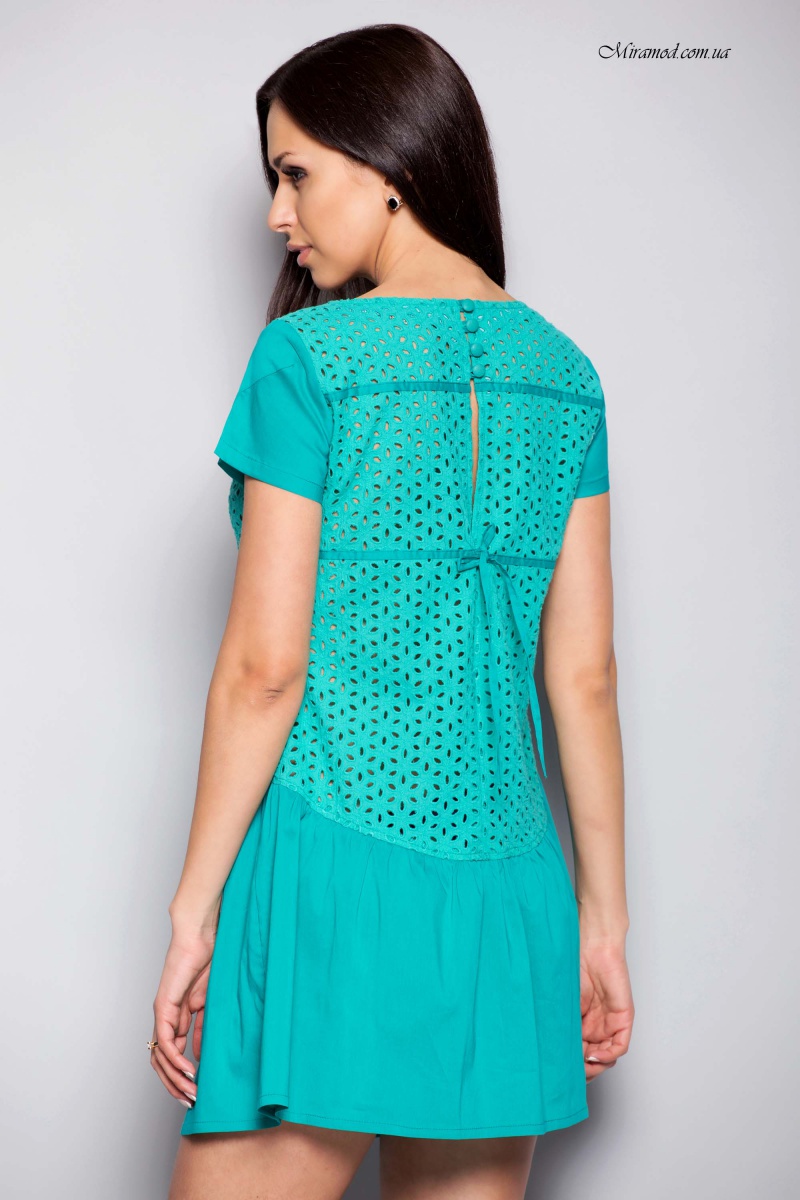 Платье КЕМЕР очень свободного кроя, выполненное из качественной хлопковой ткани, длиной выше линии колен. Модель с коротким рукавом и круглым вырезом горловины. Спинка дополнена вырезом-капелькой и застежкой на пуговицы с навесными петлями и украшена бантиком-завязкой.