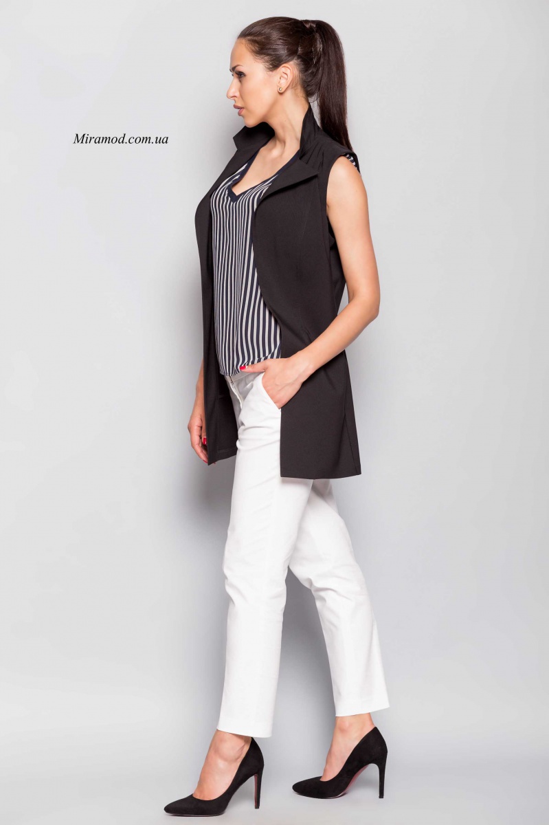 Удлиненный жилет ВИЗИТ прямого силуэта выполнен из ткани средней растяжимости. Изделие без застежки с отложным воротником. Модель дополнена функциональными карманами