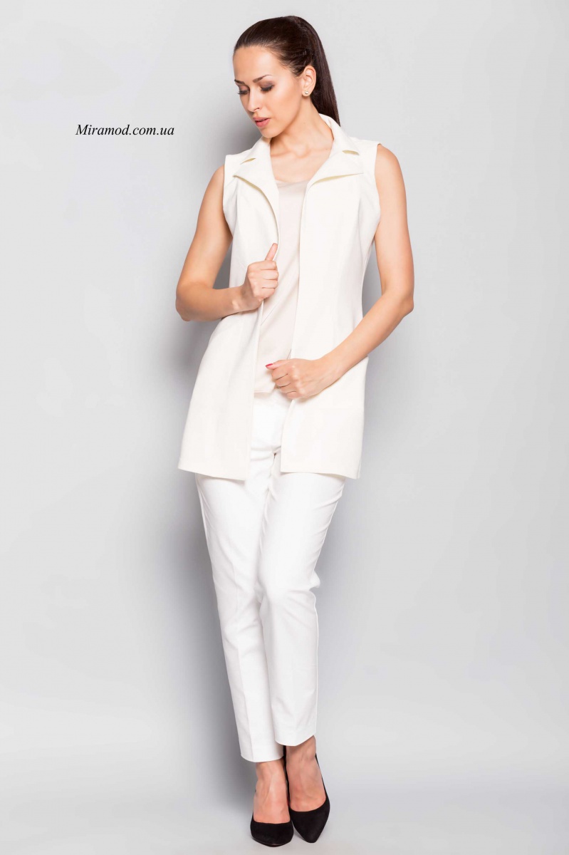 Удлиненный жилет ВИЗИТ прямого силуэта выполнен из ткани средней растяжимости. Изделие без застежки с отложным воротником. Модель дополнена функциональными карманами
