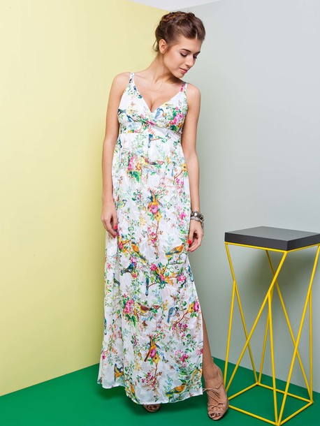 Сарафан в пол из шифона на подкладке, разрезы по боковым швам изделия способствуют удобству при ходьбе. Верх спинки отстрочен ниткой резинкой, что позволяет плотно фиксировать лиф изделия.