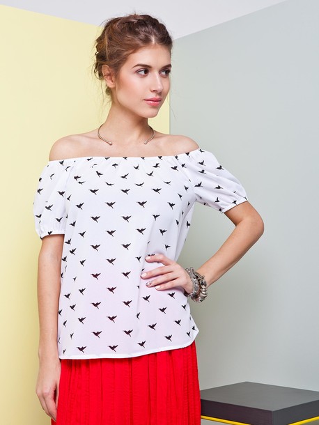 Блуза свободного фасона, рукав фонарик, горловина присобрана на резинку, возможно носить спущено на плечи. Подходит как к романтическому образу, так и к одежде джинсового стиля.
