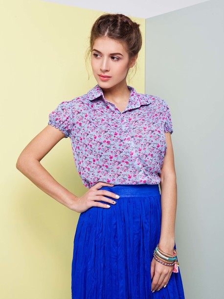 Блуза из шифона - креш, силуэт прямой, рукав фиксируется ниткой - резинкой, небольшой отложной воротник круглой формы, нежный цветочный принт ткани, легко комбинируется с цветовой гаммой этого сезона.