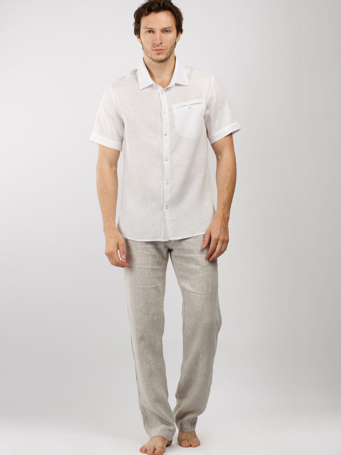 Мужская льняная рубашка свободного кроя с коротким рукавом . Классический отложной воротник, застежка - на пуговицы. Один нагрудный прорезной карман "в рамку" на пуговице.
