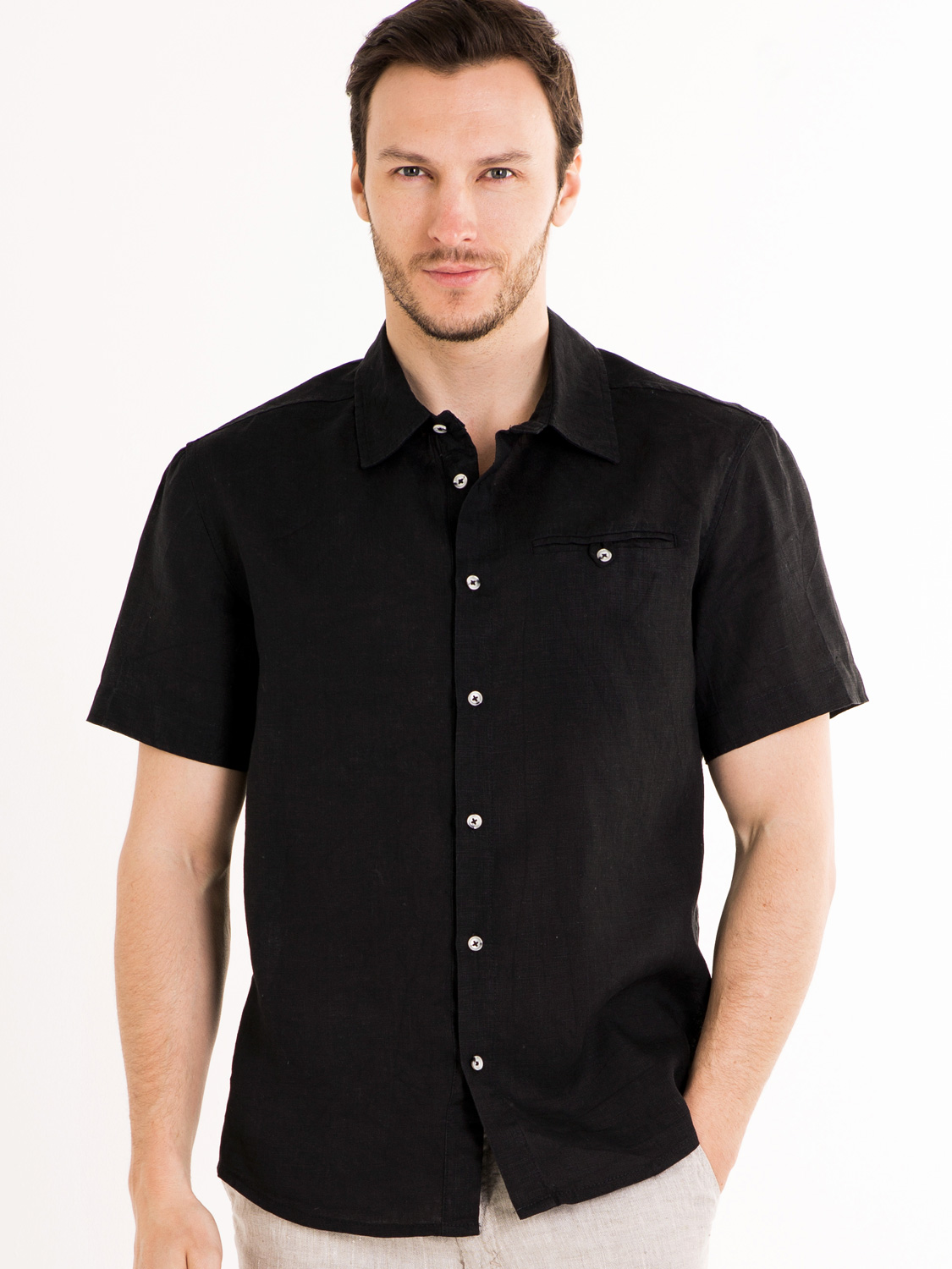 Мужская льняная рубашка свободного кроя с коротким рукавом . Классический отложной воротник, застежка - на пуговицы. Один нагрудный прорезной карман "в рамку" на пуговице.