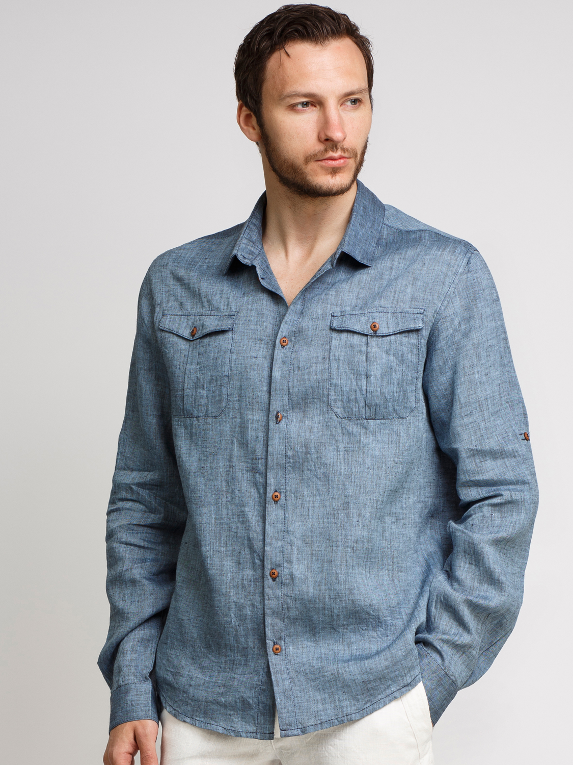 Мужская рубашка из 100% льна с длинным рукавом в стиле "casual". Свободный крой. Отложной воротник, центральная застежка - на пуговицы.
