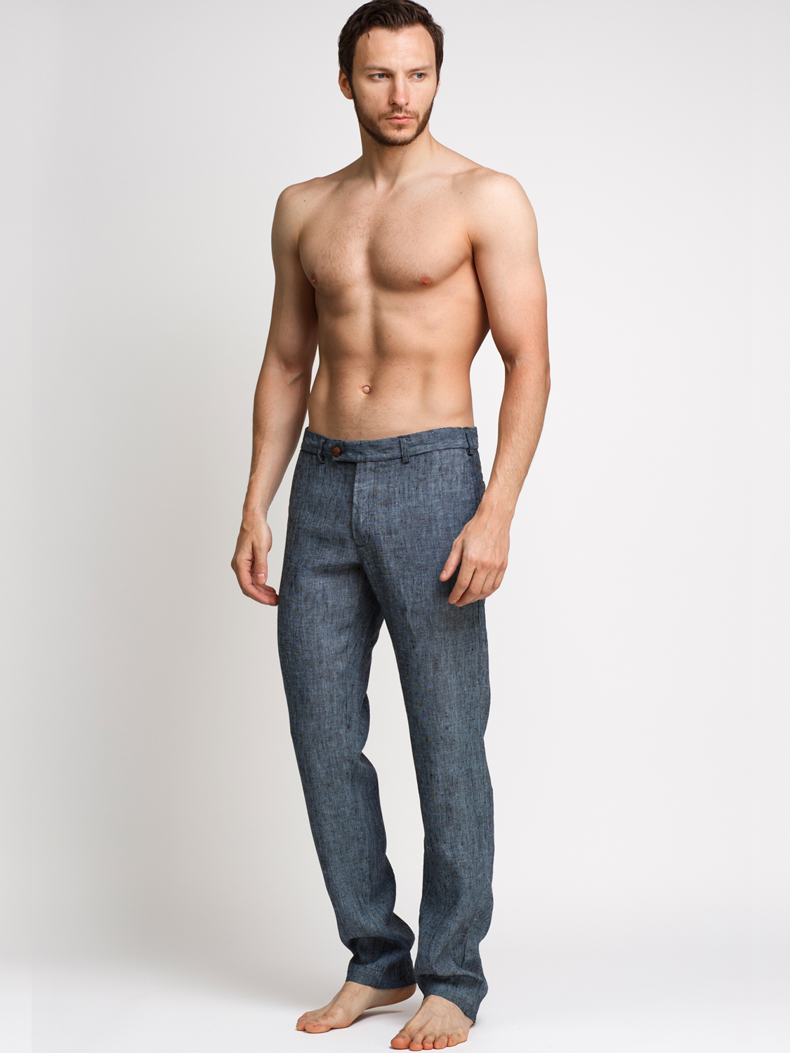 Мужские льняные брюки классического кроя слегка зауженные от колена к низу. В сезоне Лето 2016 представлены в 5 популярных цветах. Боковые прорезные карманы-хулиганы.