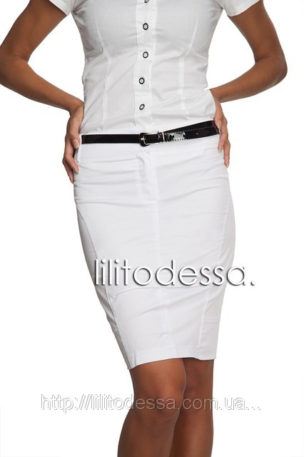 Юбка заужена к низу, с драпировкой на лицевой и задней сторонах. Разрез на молнии. Пояс в комплекте.