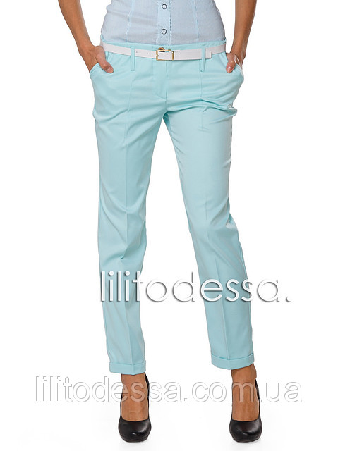 Брюки с средней посадкой, зауженные к низу, длина выше щиколотки, с косыми карманами по бокам и имитацией карманов сзади. Лёгкая ткань - полированный каттон. Сезон Весна-Лето, Длина - ок.92см., Внутренний шов - ок.69см.
